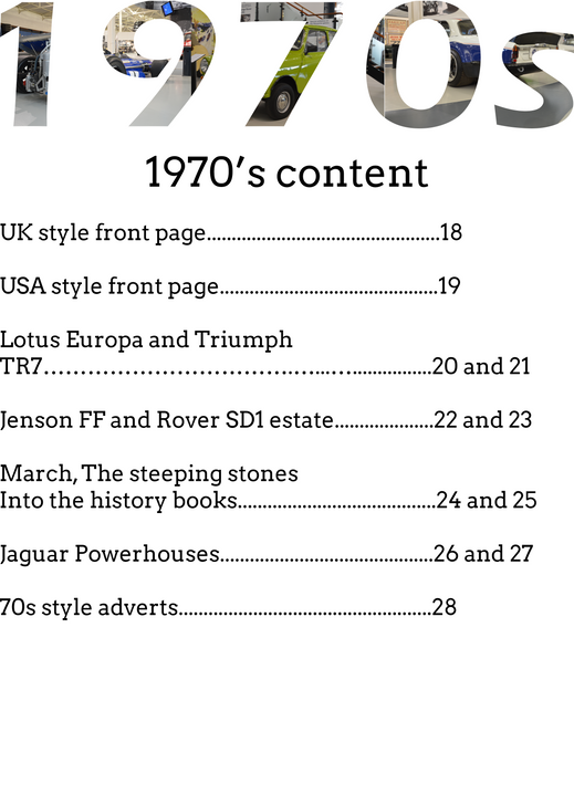 With this magazine I have created how I wanted to showcase the different styles of automotive magazines throughout the 1960's up to the 1980's in both UK and America. The photos I have used are what I took at the British Motor Museum. I decided to take photos of cars from each of the eras to showcase in each decades section in the magazine. The fonts, layouts and colours are period correct however, the content I have written isn't as I wanted to display the change in styles throughout the decades.